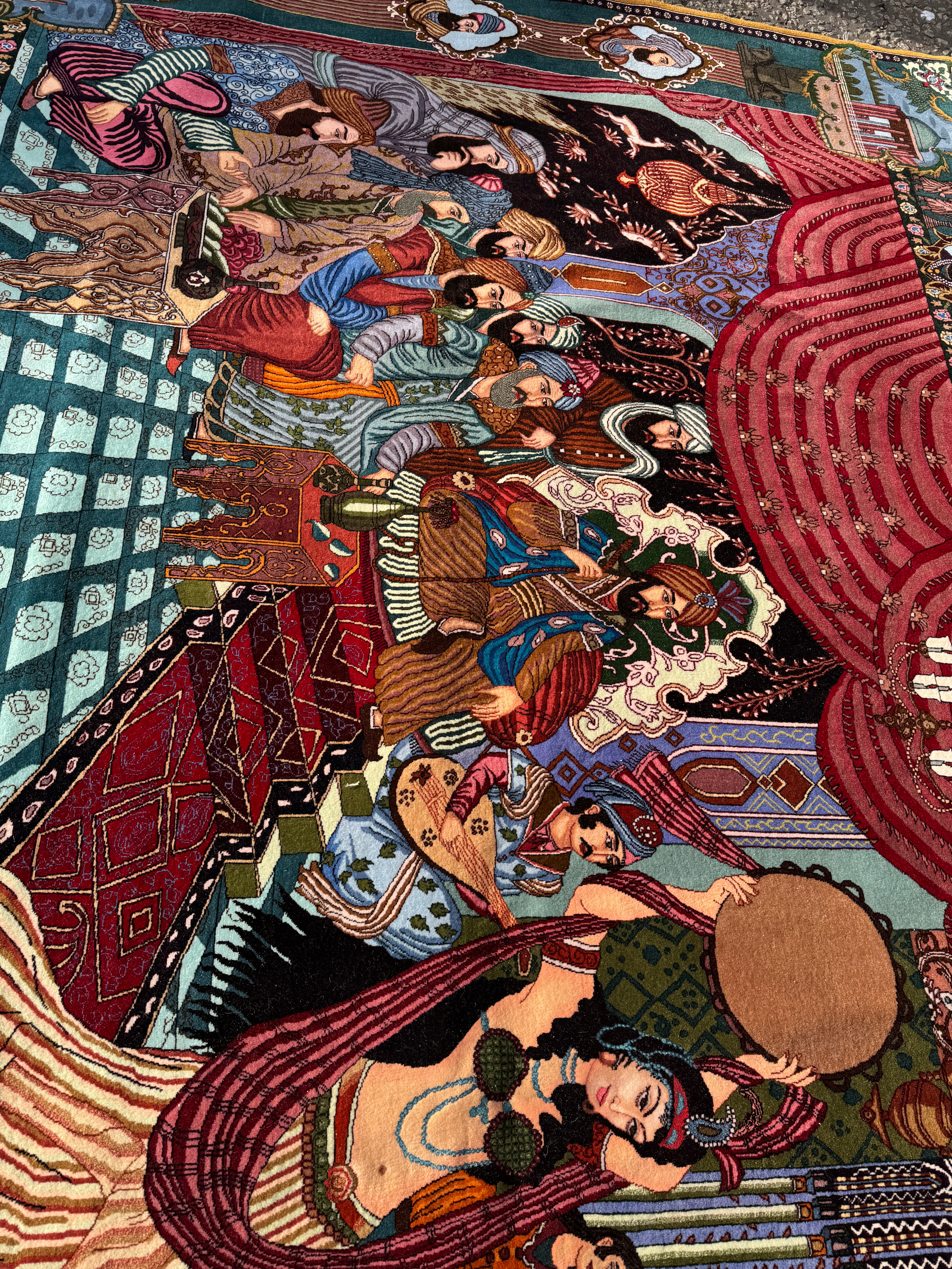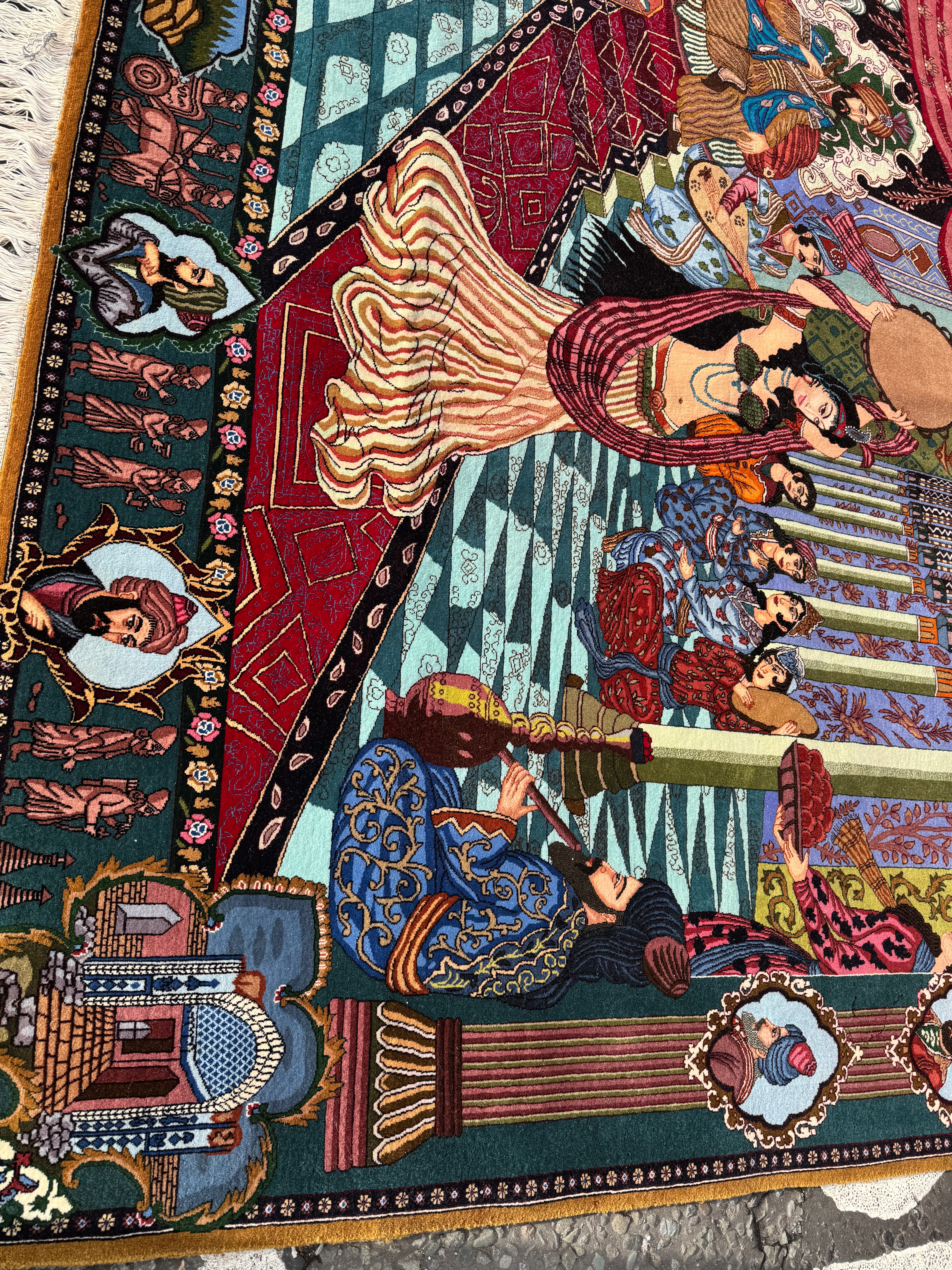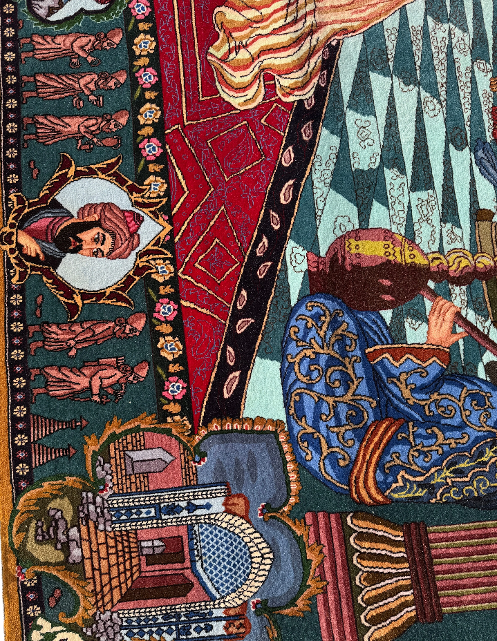 Decorative rug with intricate patterns and figures on a white background