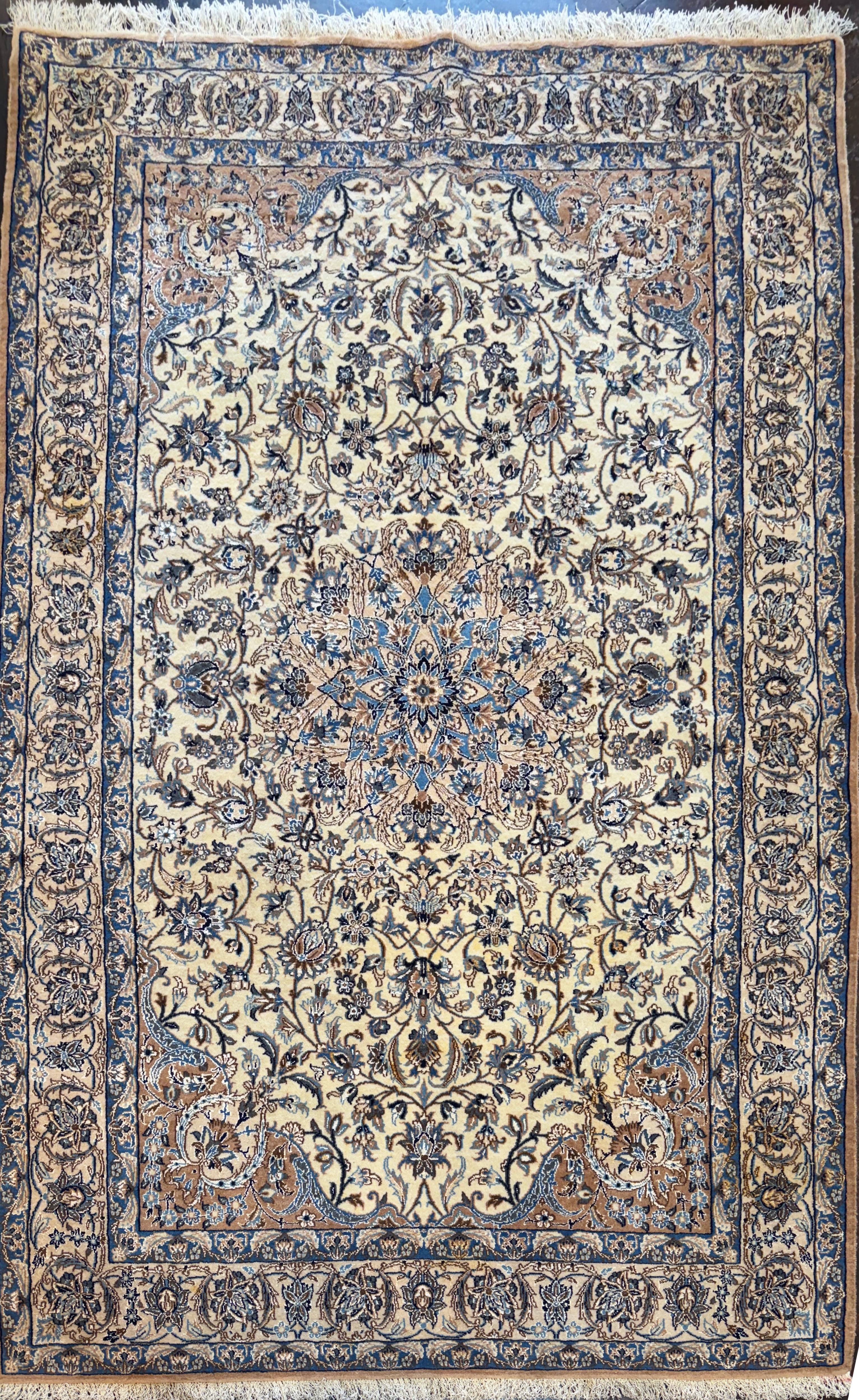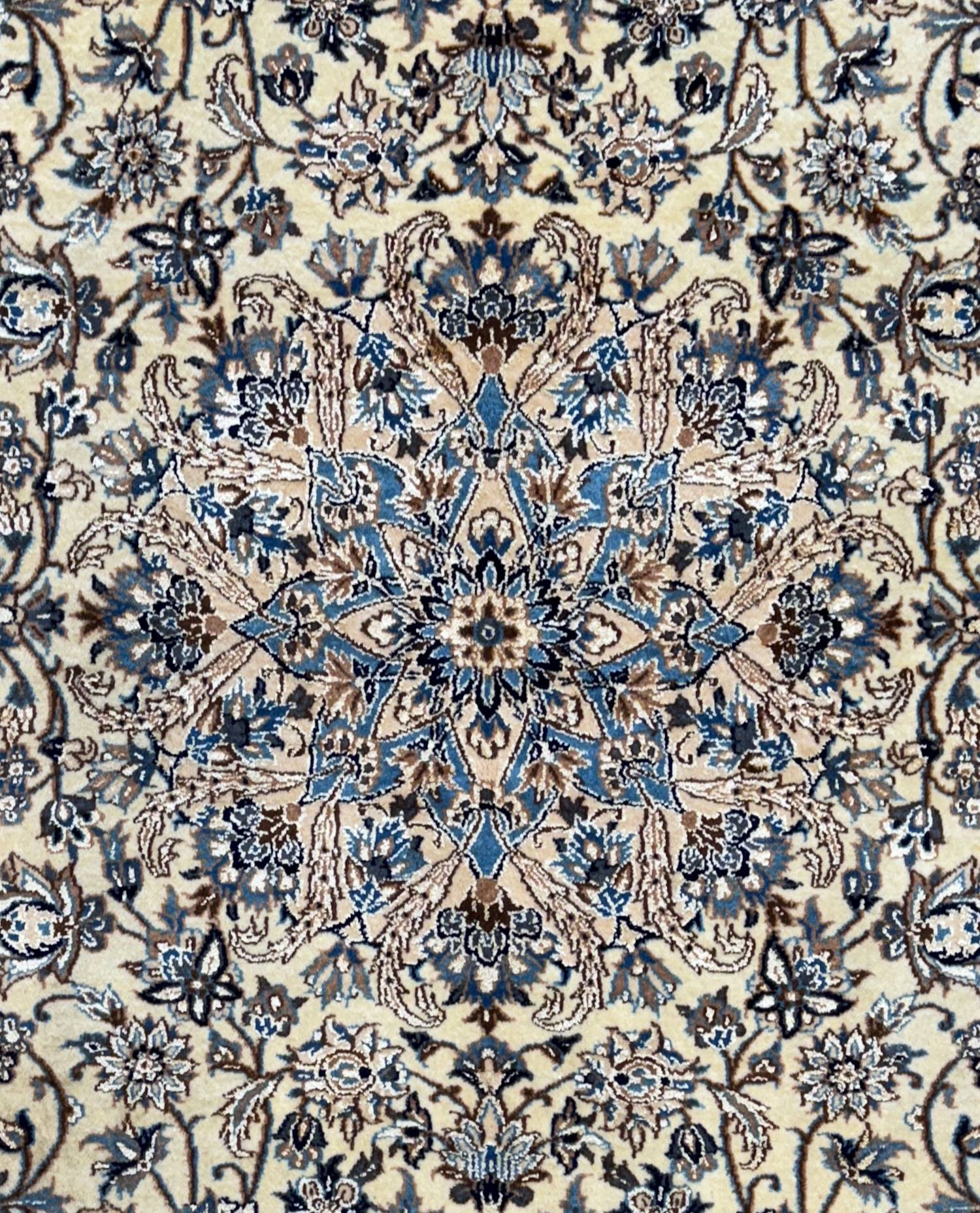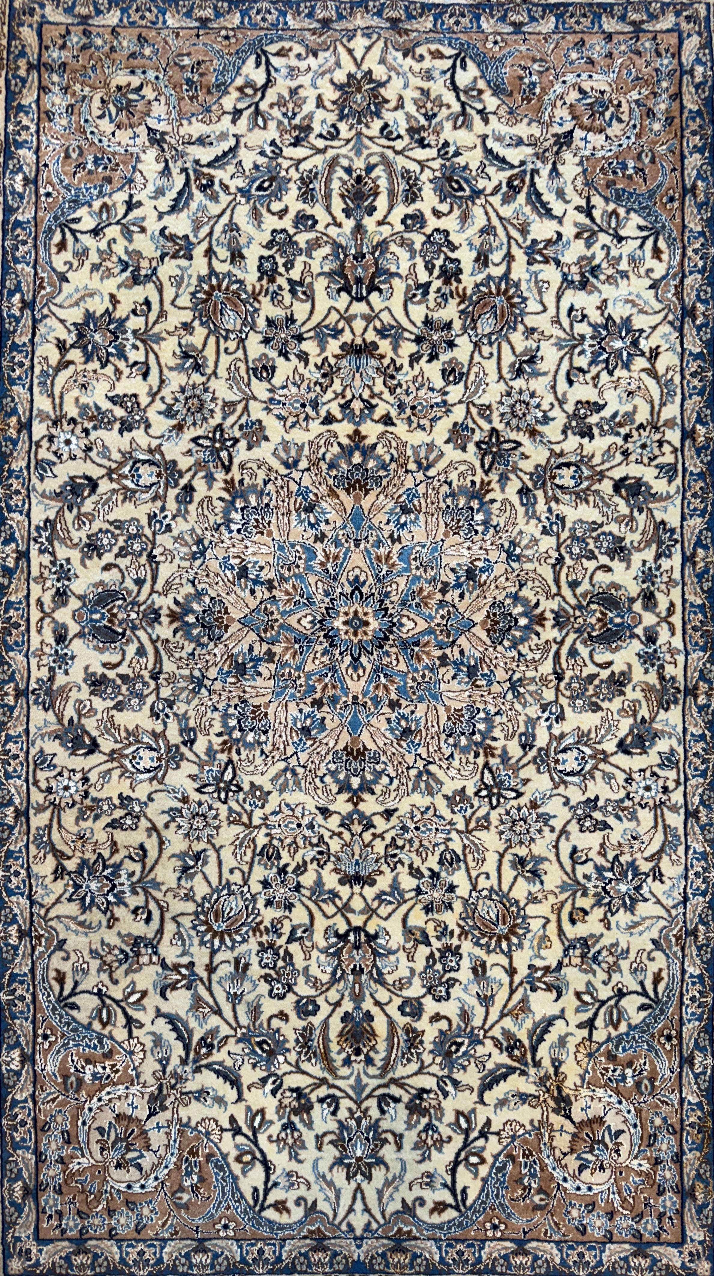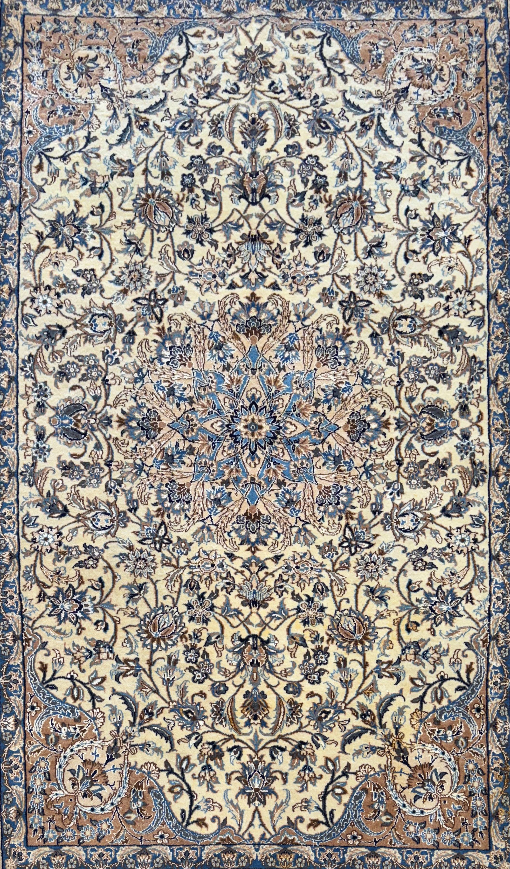 This exquisite Isfahan rug from Iran features the stunning Naael design, expertly handwoven with a luxurious silk pile. This new piece exemplifies exceptional craftsmanship, making it a perfect addition to any elegant decor.