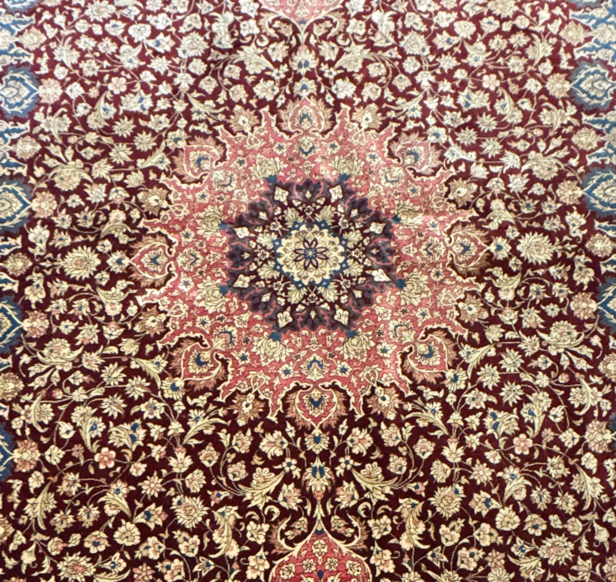 This exquisite Qum rug from Iran showcases a traditional Ghabi design. Handcrafted with a wool pile and intricate patterns, it blends the rich cultural heritage of Persian rug weaving with modern craftsmanship, making it a prized addition to any space.
